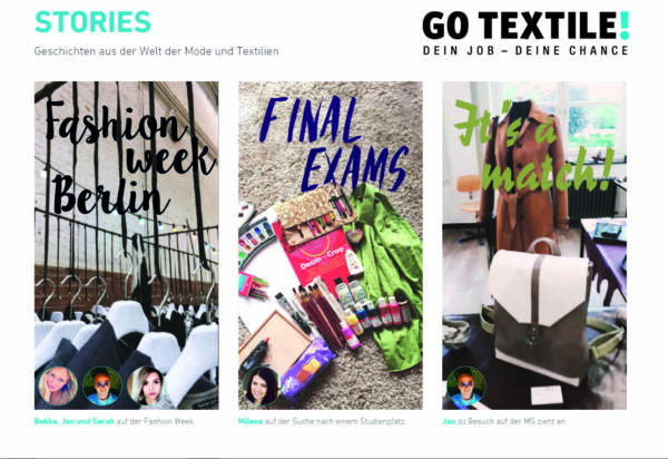 Aktuell bietet die Initiative Jugendlichen einen exklusiven Blick hinter die Kulissen der Branche: Auszubildende und Studierende aus der Textil- und Bekleidungsindustrie – das Team Go Textile!– geben spannende Einblicke in ihren Alltag im Ausbildungsbetrieb, an Schule oder Hochschule, berichten von Events und halten Interessierte in den sozialen Netzwerken immer auf dem Laufenden über innovative textile Produkte für alle Bereiche unseres Lebens. Alle Beiträge unter www.go-textile.de/team